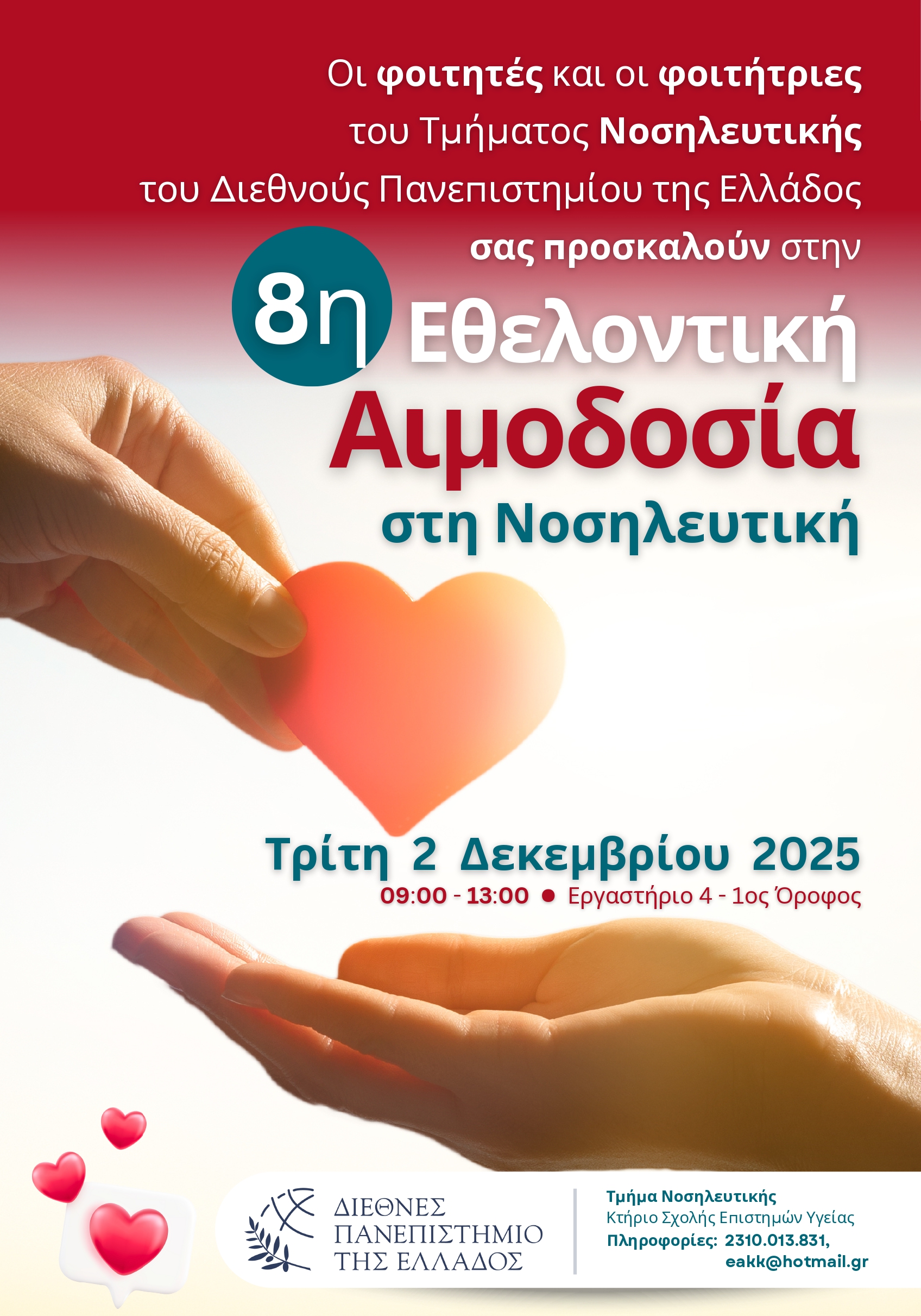 | ΕΘΕΛΟΝΤΙΚΗ ΑΙΜΟΔΟΣΙΑ ΣΤΗ ΝΟΣΗΛΕΥΤΙΚΗ | 15 Δεκ 2024 | Καλούνται οι φοιτητές /τριες του τμήματος Νοσηλευτικής όπως συμμετάσχουν και αιμοδοτήσουν στην 7η Αιμοδοσία στην Νοσηλευτική που θα διεξαχθεί την Πέμπτη 19/12/2024 στο εργαστήριο 4 απο τις 9:00 έως την 13:00. Σας περιμένουμε Δώστε αίμα - Σώστε Ζωές | Κατέβασμα |